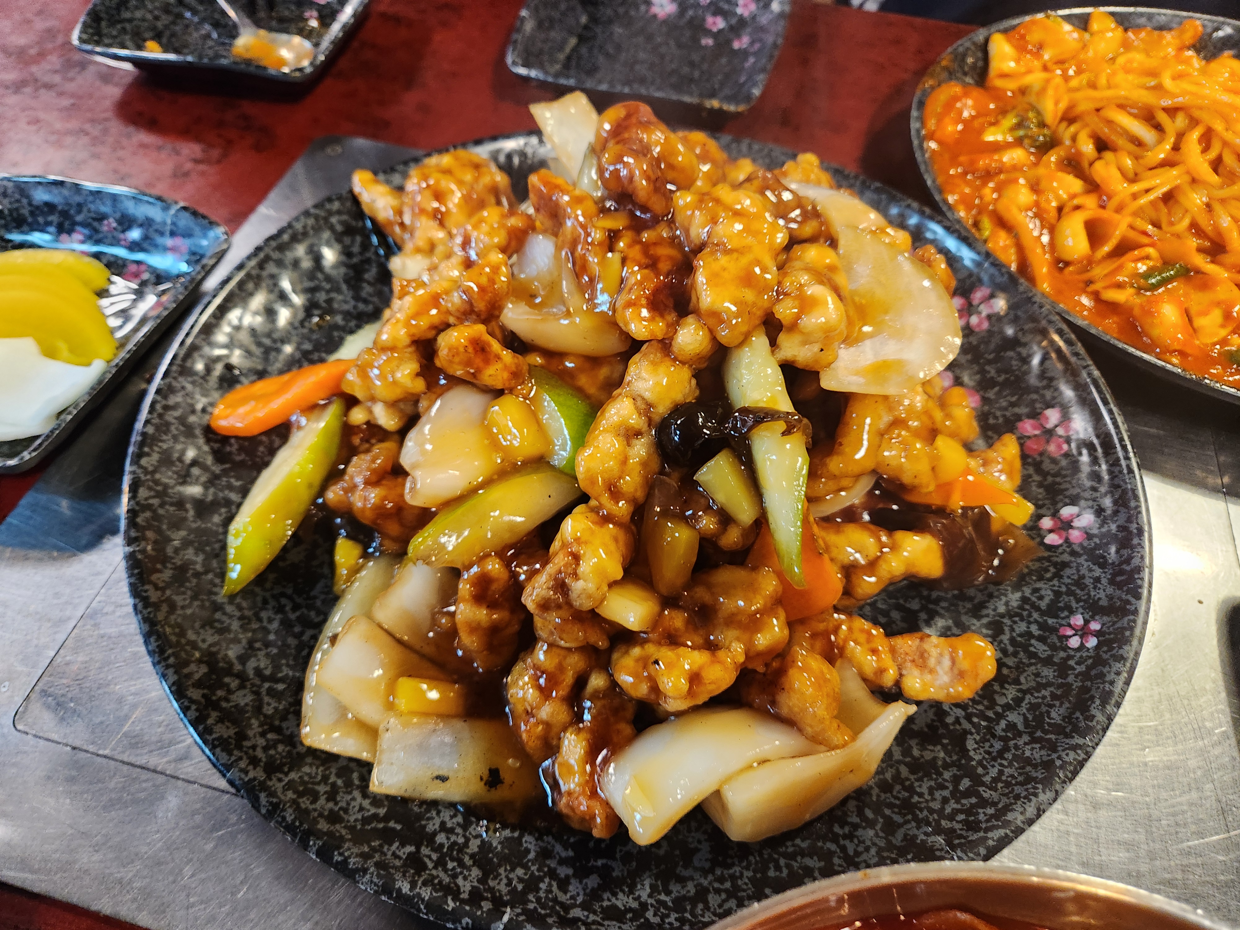 바삭하게 튀겨낸 고기가 겉은 바삭, 속은 촉촉했어요. 소스는 새콤달콤하면서도 농도가 적당히 걸쭉해서 튀김에 잘 스며들었고, 찍먹·부먹 어디에도 잘 어울리는 타입이었습니다. 양도 넉넉해서 3~4명이 함께 먹기에 충분했어요.